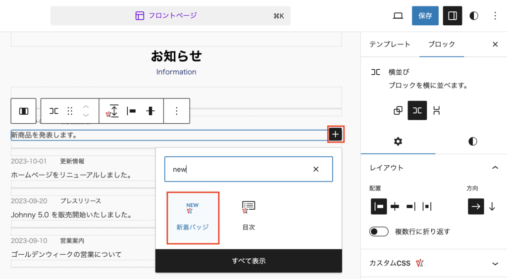 新着バッジブロックは、X-T9 など主にブロックテーマ向けのブロックです。