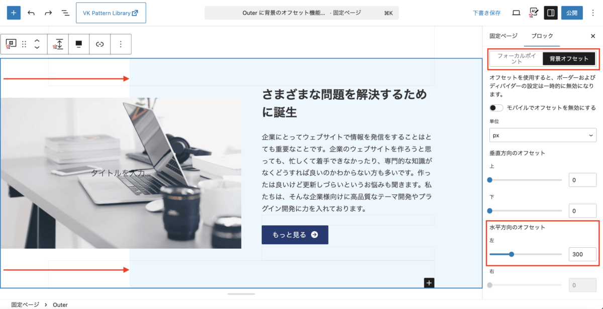 - モバイルでオフセットを無効にする:画面幅の狭いモバイルでは背景をずらしたくないときにオンにしてください。