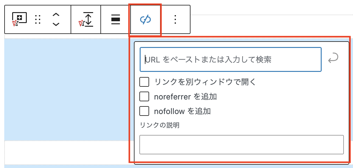 ブロックツールバーの「リンクURL」からリンクの設置が可能です。ヒーローエリアなど全体にリンクをクリックできるようにしたい時にご利用ください。