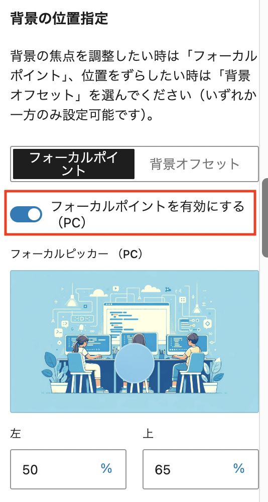 背景の焦点を調整したい時は「フォーカルポイント」、位置をずらしたい時は「背景オフセット」で設定できます。