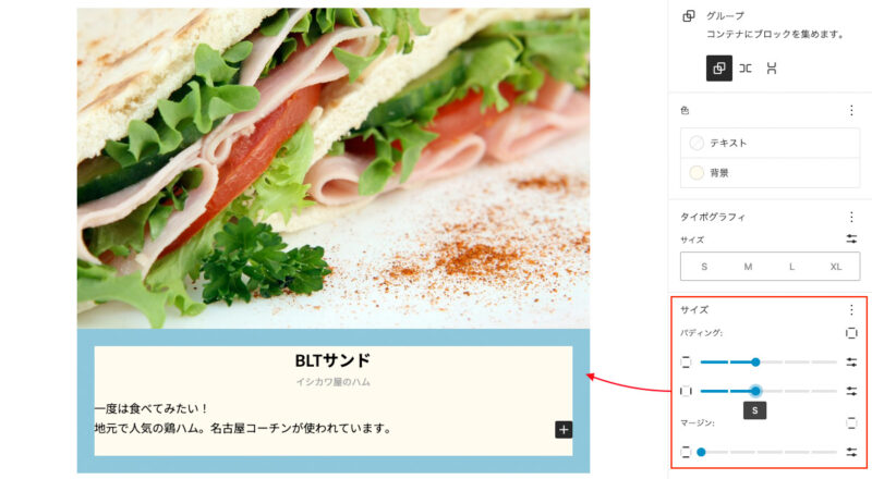 グループブロックの「スタイル」から、背景色、余白、線の色などお好みに設定できます。