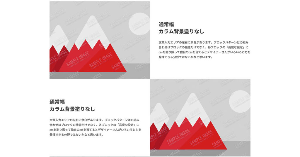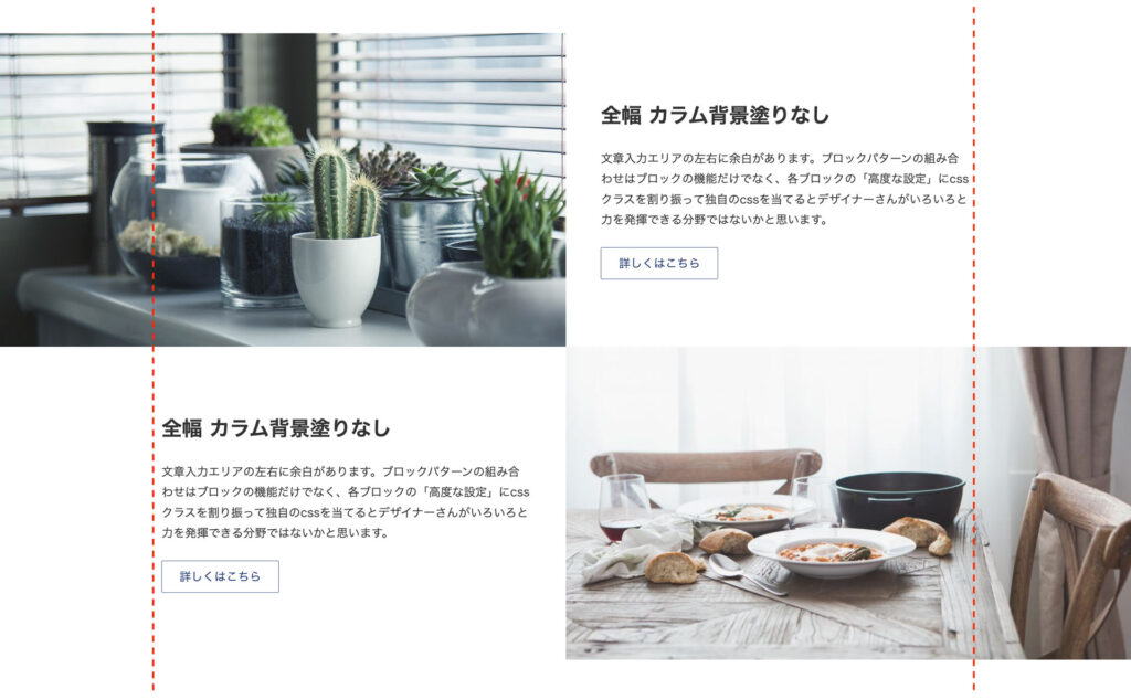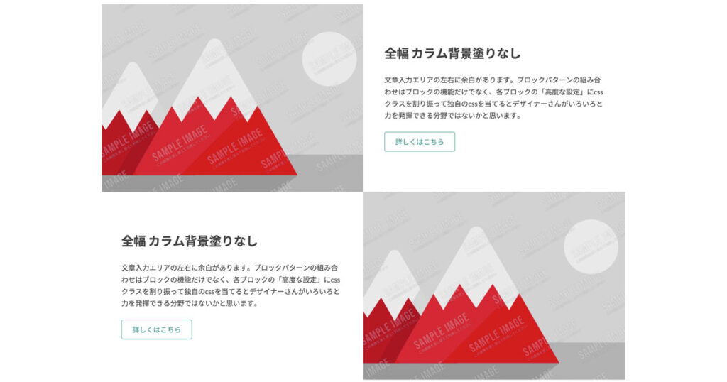 親のカラムブロックを全幅にすれば、以下のようなレイアウトも可能です。画像はコンテンツ幅を飛び出して表示され、テキストはコンテンツ幅に収まります。