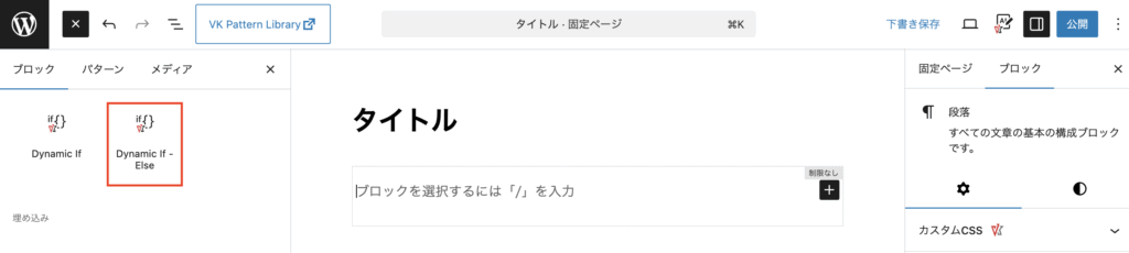 ブロックインサーターから Dynamic If をクリックして、ブロックエディターの編集画面に配置します。