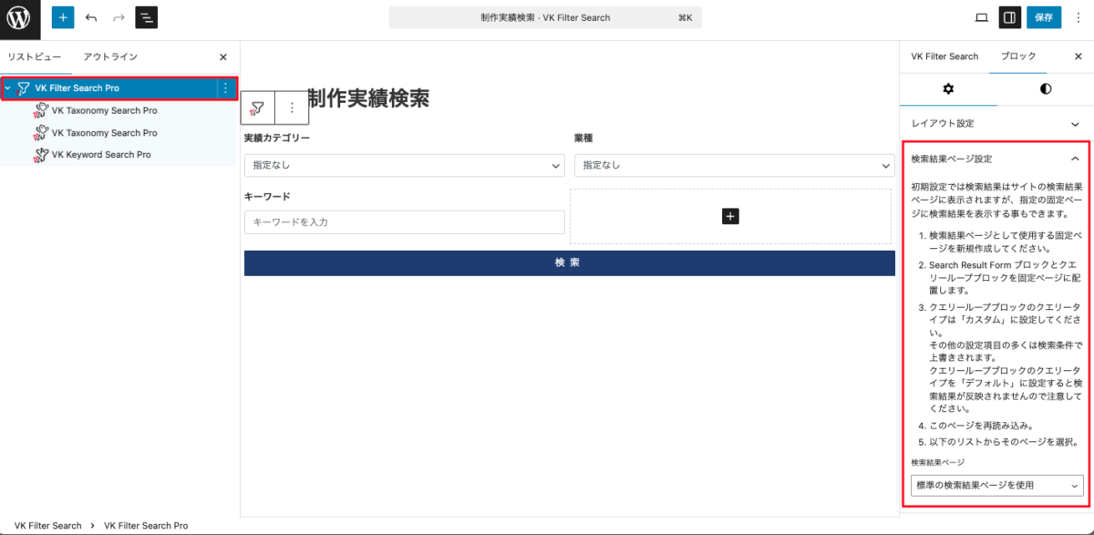 - 5.1.3. VK Filter Search ブロックから検索結果ページとして使用する固定ページを指定