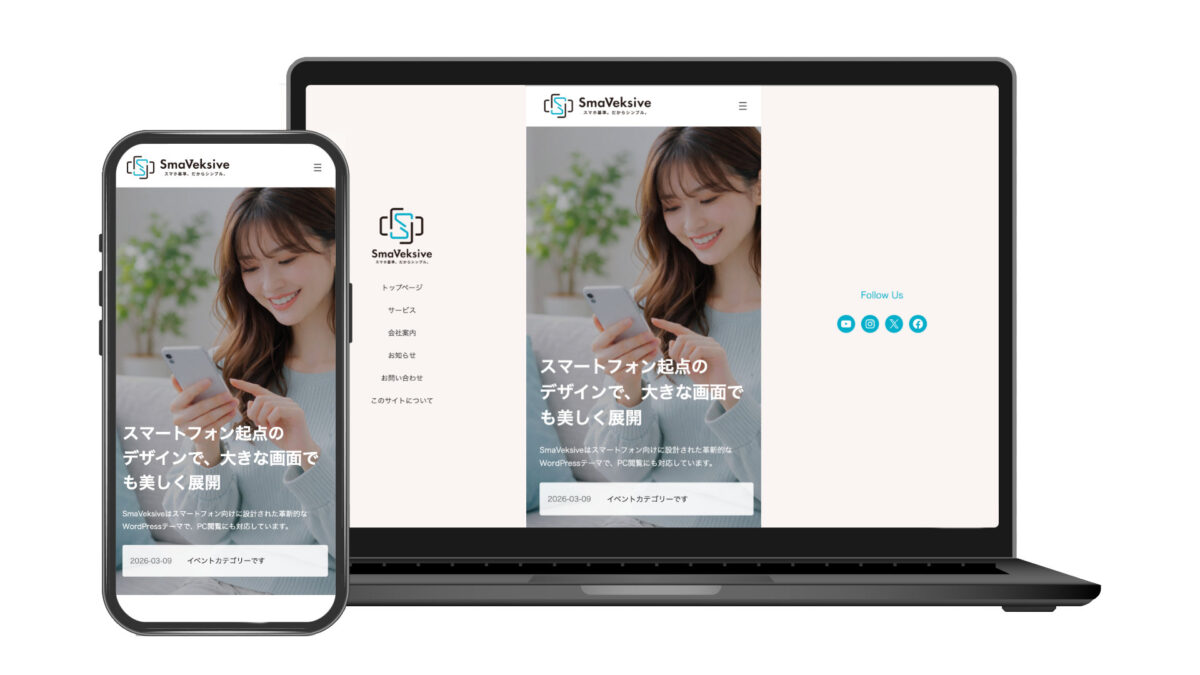 SmaVeksive(スマベクシブ)は、スマホ特化型サイトを簡単に作れる WordPress ブロックテーマです。