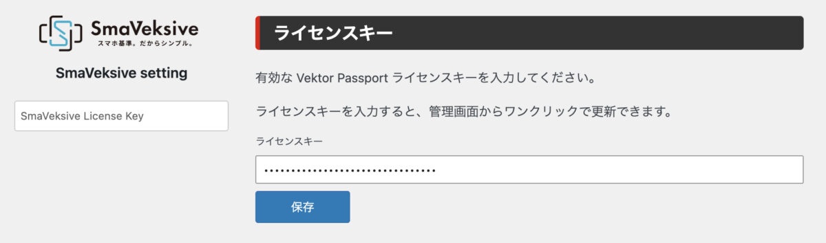Vektor Passport のライセンスキーは、管理画面 > 設定 > SmaVeksive に保存されます。