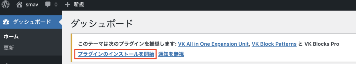 3つの推奨プラグインのインストールを促すメッセージが管理画面に表示されます。メッセージに従ってインストール・有効化してください。